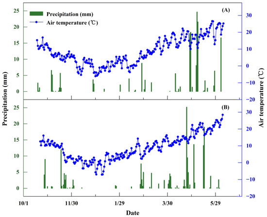 Precipitation and air temperature distributions during the winter wheat growing seasons in 2018–2019 (A) and 2020–2021 (B).