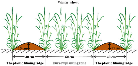 A single factor randomized block design was employed with three blocks and the following three treatments: (1) no biochar application (B0) as the control; (2) application of biochar at 10 Mg ha−1 (B10); and (3) application of biochar at 20 Mg ha−1 (B20). Both the biochar and fertilizer were applied basally before sowing. The amounts of fertilizer applied under each treatment were the same with 225 kg ha−1 pure N, 75 kg ha−1 P2O5, and 150 kg ha−1 K2O. The main local wheat cultivar Xinong 979 was used as the test material. Wheat was sown manually in strips around October 20 each year at a rate of 2.25 million plants ha−1 with a row spacing of 20 cm, and it was harvested during early June in the following year without replanting after harvest. The RFRH planting mode was used for all of the treatments (Figure 2), where the widths of the furrows and ridges were 60 cm and 40 cm, respectively. The 15 cm-high ridges were covered with plastic film to collect precipitation and wheat was planted in the furrows. Other management measures applied in the experimental field were the same as those used for wheat production in local fields and they were consistent across treatments.