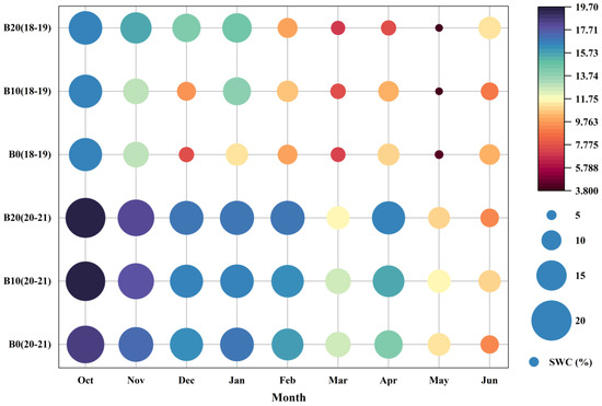 Changes in soil water content in the 0–20 cm soil layer under different amounts of added biochar during the winter wheat growing seasons in 2018–2019 and 2020–2021. Note: SWC represents soil water content. Both the size and color of the circle represent the level of soil water content. B20, B10, and B0 represent 20, 10, and 0 Mg biochar ha−1, respectively.