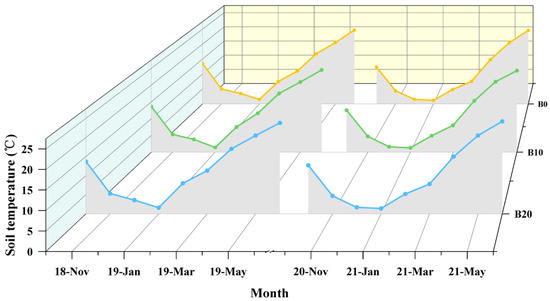 The soil temperature at a depth of 10 cm decreased initially and then increased under each treatment during the wheat growth process, with a trough period in December–January (Figure 4). The application of biochar affected soil temperature. With B0 as the control, the increasing range of soil temperature in different months varied from −6.67% to 8.57% and from −3.64% to 16.67% under B10 and B20, respectively (Figure 4). Overall, the application of biochar reduced the variations in the soil temperature range to some extent and increased the average soil temperature during the wheat growth period. Compared with B0, the average soil temperatures were 1.96–3.53% and 0.98–2.35% higher under B10 and B20, respectively (Figure 4).
