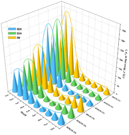 The CO2-C emission fluxes under different treatments exhibited similar seasonal variations, where they all decreased initially, before increasing and finally decreasing, with the peak occurring in May (wheat filling stage) (Figure 5). The application of biochar affected the CO2-C emission fluxes in wheat fields. With B0 as the control, the decreasing range of the CO2-C emission fluxes in different months varied from 0.48% to 39.38% and from −0.55% to 35.99% under B10 and B20, respectively (Figure 5). In general, the CO2-C emission fluxes were significantly higher under B0 than B10 and B20 during the same period (p < 0.05). Compared with B0, the average CO2-C emission fluxes were 8.54–24.64% and 7.51–31.07% lower under B10 and B20, respectively (Figure 5).