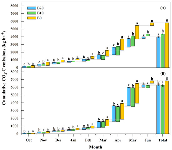 Cumulative CO2-C emissions under different amounts of added biochar during the winter wheat growing seasons in 2018–2019 (A) and 2020–2021 (B). Note: The column length represents the mean ± standard error of newly added cumulative CO2-C emissions in each stage, and different lowercase letters indicate significant differences between treatments (Duncan’s test, p < 0.05).