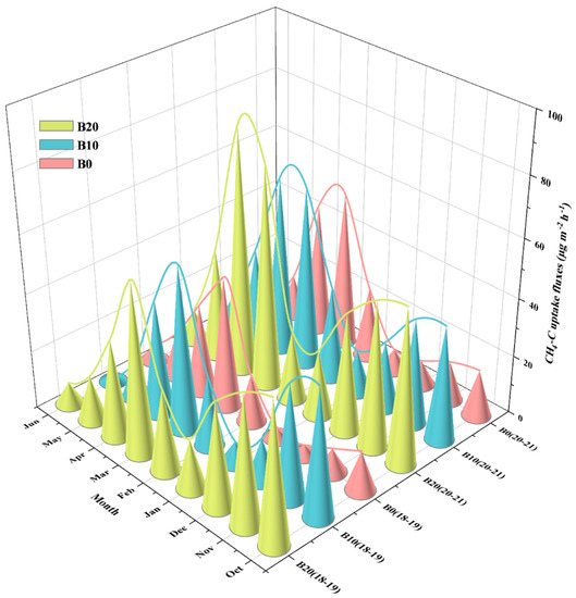 As shown in Figure 7, the CH4-C uptake fluxes under different treatments all decreased initially, before increasing and finally decreasing. The application of biochar affected the CH4-C uptake fluxes in wheat fields. With B0 as the control, the increasing range of the CH4-C uptake fluxes in different months varied from −50.00% to 370.42% and from −1.86% to 967.86% under B10 and B20, respectively (Figure 7). In general, the CH4-C uptake fluxes were significantly lower under B0 than B10 and B20 during the same period (p < 0.05). Compared with B0, the average CH4-C uptake fluxes were 59.29–65.09% and 97.93–106.68% higher under B10 and B20, respectively (Figure 7).