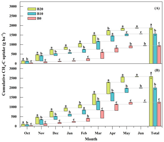 As shown in Figure 8, March–April was the active stage for soil CH4-C uptake in wheat fields, and the cumulative CH4-C uptake in this stage accounted for 36.40–58.75% of the cumulative CH4-C uptake in the whole wheat growing season. The cumulative CH4-C uptake tended to increase as the biochar application amount increased. Compared with B0, the cumulative CH4-C uptake amounts were 616.24–743.44 g ha−1 and 926.72–1337.69 g ha−1 higher under B10 and B20, respectively (Figure 8).