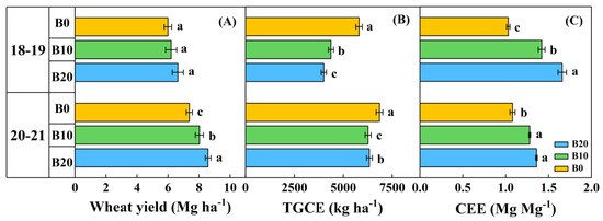 Wheat yield (A), total gaseous carbon emissions (B), and carbon emission efficiency (C) under different amounts of added biochar in 2018–2019 and 2020–2021. Note: TGCE represents total gaseous carbon emissions and CEE represents carbon emission efficiency. Values represent means ± standard errors and different lowercase letters indicate significant differences between treatments (Duncan’s test, p < 0.05).
