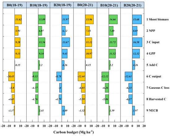 The application of biochar significantly increased the C inputs in wheat fields (p < 0.05). Compared with B0, the C inputs were 23.38–24.35% and 47.31–49.10% higher under B10 and B20, respectively (Figure 10). Thus, the application of biochar significantly increased the NECB values in wheat fields (p < 0.05). Compared with B0, the NECB values were 2.91–3.58 Mg C ha−1 and 5.29–6.06 Mg C ha−1 higher under B10 and B20, respectively (Figure 10).