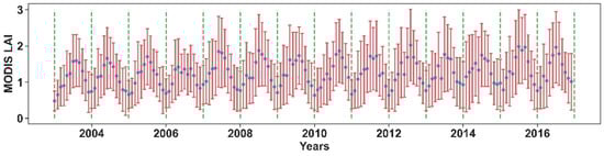The mean curve of MODIS LAI in Henan Province from 2003 to 2016. The red line is the error bars plotted using standard deviation; blue dots represent the mean; between the two green dotted lines is the LAI for one year.