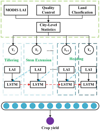 In the LSTM network, a memory unit c can capture a key piece of information at a certain moment and can store this key information for a certain time interval. The lifetime of information stored in memory unit c is longer than that of short-term memory h but much shorter than that of long-term memory. Figure 4 shows the workflow from LAI data processing to LSTM model building and yield estimation.