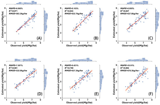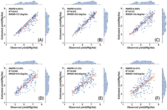 Comparison of yield estimation results for LSTM models based on different time steps: (A) one time step; (B) two time steps; (C) three time steps; (D) four time steps; (E) five time steps; and (F) six time steps. The probability distributions of the statistical and estimated yields are plotted on the right and top of the Y axis, respectively.