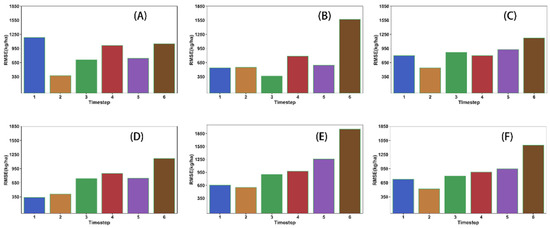 The model performance (predicted RMSE) using different time steps for the whole growing season. (A) one time step; (B) two time steps; (C) three time steps; (D) four time steps; (E) five time steps; and (F) six time steps.