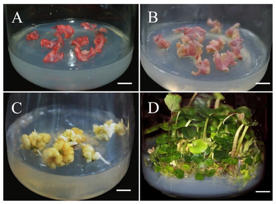 In vitro plant regeneration from leaf segments of two aneuploids of ‘Red Flash’ caladium (Caladium × hortulanum Birdsey), namely, the SVT9 and the SVT14. (A) Leaf segments of the SVT9 cultured on MS basal medium supplemented with 0.5 mg·L−1 NAA and 1.0 mg·L−1 6-BA for 10 days; (B) initiated callus from the edge of the excised leaf pieces of the SVT14 after one month of culture; (C) shoots or roots regenerated from the excised leaf pieces of the SVT9 after 3 months’ culture; (D) plantlets regenerated from the excised leaf pieces of the SVT9 after 5 months’ culture. Bars = 1 cm.