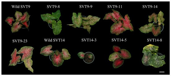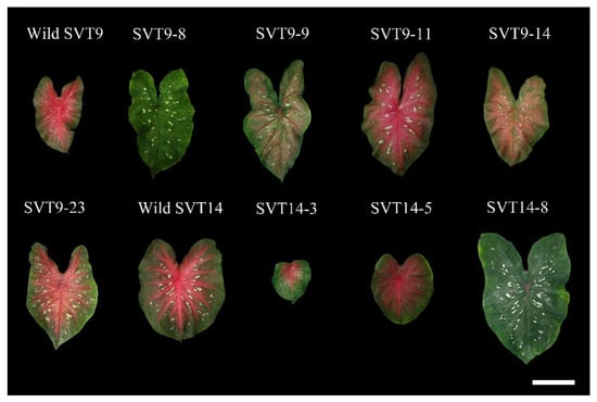 Main vein color is considered to be controlled by a single nuclear locus (V) with three alleles, namely, Vr (red), Vw (white), and Vg (green), with a dominance order of Vr > Vw > Vg []. Changes in main vein color have been observed in somaclonal variants [,] and antimitotic agent-induced variants in caladium [,]. In this study, green main veins were observed in SVT9-8, SVT9-14, and SVT14-8 (Figure 2 and Figure 3 and Table 1). The wild SVT9 and SVT14 were both characterized by red main veins; thus, the occurrence of green main veins in the three variants might result from the mutation of Vr and Vw to Vg or from the loss of the Vr and Vw alleles. In addition, Deng et al. reported that leaf spots are controlled by a single locus with two alleles in caladium, namely, the dominant allele S and recessive allele s []. The SVT14-5 lost four chromosomes and had no leaf spots (Figure 2), which might be caused by a mutation from Ss to ss or SS to ss. These assumptions need more detailed evidence to support them.
