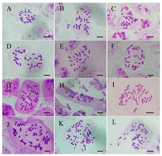 Micrographs of somatic chromosomes in the root tips of the randomly selected plants regenerated from the SVT9 and the SVT14 in vitro and their corresponding parent. (A) Wild SVT9 (2n = 2x − 2 = 28); (B) SVT9-8 (2n = 2x − 3 = 27); (C) SVT9-14 (2n = 2x − 3 = 27); (D) SVT9-9 (2n = 2x − 1 = 29); (E) SVT9-11 (2n = 2x − 1 = 29); (F) SVT9-4 (2n = 2x = 30); (G) SVT9-23 (2n = 2x = 30); (H) wild SVT14 (2n = 4x − 6 = 54); (I) SVT14-1 (2n = 4x − 4 = 56); (J) SVT14-3 (2n = 4x − 10 = 50); (K) SVT14-5 (2n = 4x − 10 = 50); (L) SVT14-8 (2n = 4x − 10 = 50). Bars = 10 μm.