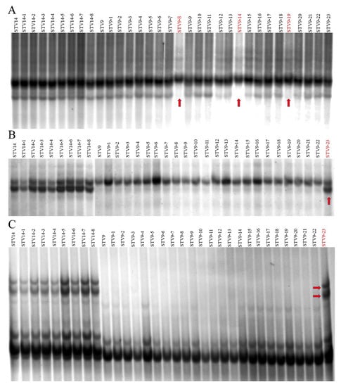 SSR banding pattern of the randomly selected 23 and 8 plants regenerated from the SVT9 and the SVT14, respectively. (A) Banding patterns of SSR marker CaM16; (B) banding patterns of SSR marker CaM42; (C) banding patterns of SSR marker CaM101. Red arrows indicate the presence or absence of SSR bands in the in vitro-regenerated plants.