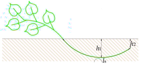 The springtime transplanting of sweet potatoes is often performed with seedlings that are longer than 250 mm and that are naked. As illustrated in Figure 1, the boat-bottom-shaped sweet potato must be film mulched before the transplanting takes place. After the transplanting process, the root depth of the seedlings (RDS) should be between 20 mm and 30 mm, the node depth in the middle of the seedling (NDMS) should be between 40 mm and 60 mm, and the stalk length that is in the soil (SLS) should be between 180 mm and 220 mm. The range of the plant spacing should be from 180 mm to 300 mm [22].