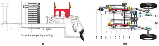 To meet the agronomic requirements in Section 2.1, an up-film transplanting device was designed to achieve boat-bottom-shaped sweet potato transplants. As shown in Figure 2, Figure 2a shows the structure of the whole machine, including the seedling conveying device and the transplanting device. The seedling conveying device follows the previous research results [16]. Figure 2b is the structure diagram of the transplanting device, which is also the object of this study. The transplanting apparatus is made up of the clamping mechanism, the positioning cam, the transposition mechanism, and the transmission system. At the rotation center point of the clamping mechanism is a cam for managing the opening and closing of the arc-shaped clamping lever. Accordingly, the positioning cam and the transposition mechanism jointly constrain the position of the rotation center point of the clamping mechanism. After clamping the seedling, the clamping mechanism enters the soil by rotating counterclockwise. In the process of the clamping mechanism entering the soil, the function of the positioning cam is to eliminate the horizontal displacement of the clamping mechanism in the forward direction that is caused by the forward speed of the implement. In order to stagger the movement trajectory of the clamping mechanism leaving the soil and entering the soil, which can prevent the clamping mechanism from taking the seedling out of soil when it is unearthed, the clamping mechanism is lifted a certain distance through the transposition mechanism so that the clamping mechanism leaves the soil with a movement trajectory that is above the trajectory of movement when it is entering the soil. The clamping mechanism leaves the soil by turning clockwise after releasing the seedling. During the process of the clamping mechanism leaving the soil, the effect of the positioning cam is divided into two parts. On the one hand, this is conducted to eliminate the horizontal displacement in the advancing direction of the clamping mechanism which is caused by the advancing speed of the machine, and on the other hand, this is conducted to adjust the intersection of the clamping mechanism and the mulch film during the ascent process, which is specifically explained as eliminating the distance difference between the intersection and the soil entry position. After the clamping mechanism completely leaves the soil, the positioning cam pushes the clamping mechanism forward, and the pushing distance is equal to the forward displacement of the transplanter within a period of time, which is the length of time from which the clamping mechanism enters soil to when it leaves soil. When the clamping mechanism is pushed back to the predetermined position, the preparation for gripping the next seedling begins.