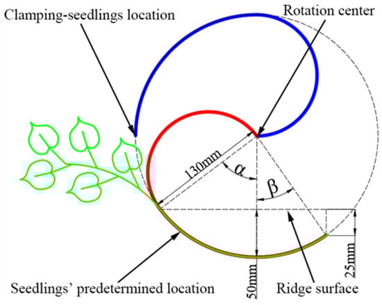 In order to make sure that the damage that the clamping mechanism causes to the mulch film only occurs in a specific position, a clamping mechanism was designed in which the arc-shaped clamping rod moves in a reciprocating manner to it; this position is where the clamping mechanism enters the mulch film, and the movement trajectory of the end of the clamping mechanism in the soil can meet the agronomic needs of sweet potato’s boat-bottom-shaped transplanting device, such as shown in Figure 3. According to the agronomic requirements that are described in Section 2.1, the following agronomic parameters were used in the design of the mechanism: the theoretical submerged depth of the nodes in the middle of the seedling was 50 mm, while the theoretical depth of the seedling’s root was 25 mm. The constraint condition for the radius of the arc-shaped gripping rod was given by Equation (1). Let x represent the radius of the rotation of the gripping mechanism and set α + β represent the angle that is occupied by the arc that is formed when the sweet potato seedlings are buried in the soil. The calculation indicates that the radius was 130 mm, α = 52°, and β = 36°.