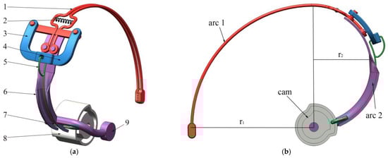 (a): Structure diagram of clamping mechanism. b: Side view of clamping mechanism. Notes: 1. clamping rod; 2. tensile spring; 3. L rod 1; 4, L rod 2; 5. iron ring; 6. concave slide; 7. parts connecting the cam; 8. cam; 9. handle. In (b), the r1 is the radius of arc 1, and its value is 130 mm. The r2 is the radius of arc 2, and its value is 65 mm.