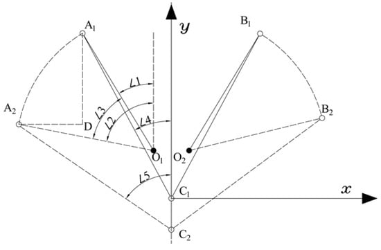 The opening and closing process of the gripping mechanism is shown in the schematic diagram of Figure 5, in which it can be known that the L rod realizes the opening and closing movement of the gripping mechanism, which is by controlling the rotation of the gripping rod. The angle of rotation of the gripper rod is ∠3, which can be expressed as Equation (2):