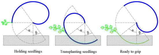 Stage 6: After the first five stages, the transplanting process and the resetting of the arc-shaped gripping rod have been performed within one working cycle of the cam. The purpose of this stage is to make the arc-shaped gripping rod enter the ready state for it to grip the seedlings.