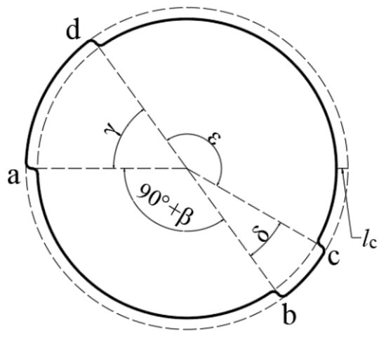 The cam controls the gripping mechanism’s opening and closing movements. According to the Formula (1), the angle of the sweet potato seedlings which form the arc in the soil is α + β = 88°. With reference to the working process of the gripping mechanism that is depicted in Figure 7, it is possible to determine the working area of the gripping mechanism for grasping the seedlings, as well as the key time nodes from opening to closing and from closing to opening. As shown in Figure 8, one rotation of the cam according to a-b-c-d-a is a working cycle. The height of the cam lift is the distance of lc.