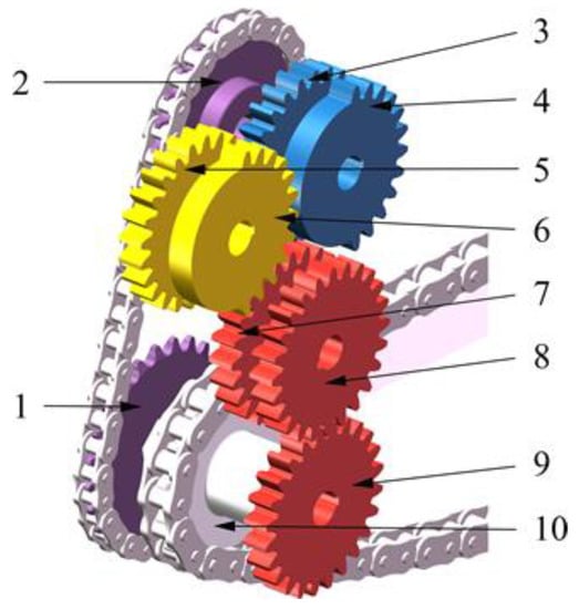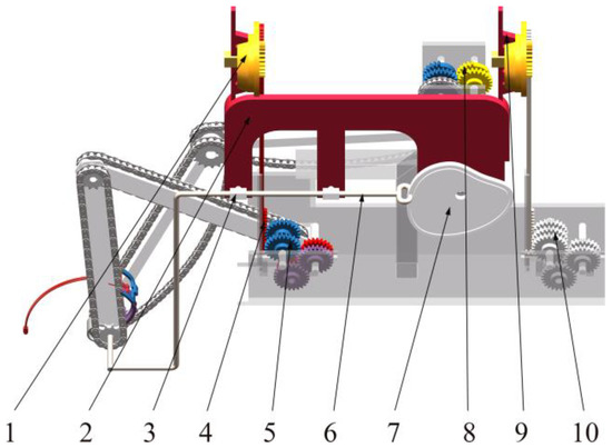 A commutation gear set, which is depicted in Figure 9, was built in order to implement the forward and reverse rotation of the grasping mechanism that is described in Section 2.3.2’s Figure 5. The entire commutation gear set is driven by the rotation of sprocket 1. Sprocket 1 drives sprocket 2 to rotate through the chain. Sprocket 2 drives gear 3 and gear 4 to rotate at the same angular speed. Gear 5 and gear 6 rotate at the same angular velocity. Gear 3 meshes with gear 5. Gear 4 and gear 6 are gears that have half the number of teeth missing in them, and alternately, they mesh with gear 7 to drive gear 7 to rotate forward and reverse periodically. Finally, the sprocket 10 is driven to rotate forward and reverse through gear 8 and gear 9. Sprocket 10 transmits the power to the sprocket that is fixedly connected to the rotation center of the clamping mechanism so as to realize the forward and reverse rotation of the clamping mechanism.