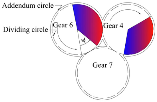 The residual gear plays an important role in the commutation drive system. However, it is precisely because of the existence of the residual gear that its transmission characteristics cannot be expressed with a traditional transmission ratio. Therefore, we set out from the indexing arc degree that is occupied by the teeth in the residual gear to describe its transmission relationship. In Figure 9, the addendum circle diameters of gear 3, gear 4, gear 5, gear 6, and gear 7 are equal. However, the meshing of the gears is constrained by the diameter of the dividing circle. Therefore, the diameter of the dividing circle should be taken into consideration when one is designing the number of teeth of the residual gear. The angle of the tooth distribution in the residual gear follows the calculation rules of Formula (7) and (8).