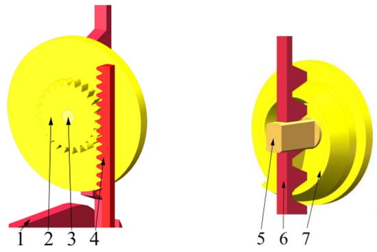 Schematic diagram of a gear based on Archimedes’ helix: 1. slidable board; 2. gear; 3. central rotation point; 4 sliding rack 1; 5. slider; 6. sliding rack 2; 7. Archimedes spiral slide.