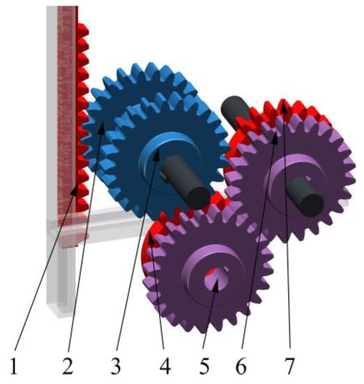 Structure diagram of commutation gear set 2: 1. sliding rack 1; 2. gear 1; 3. gear 2; 4. residual gear 1; 5. gear 3; 6. gear 4; 7. residual gear 2.