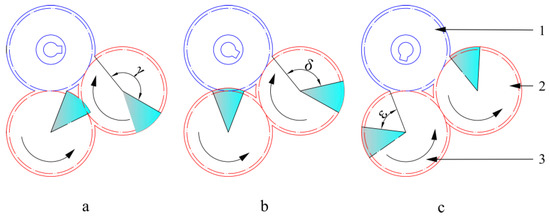 Figure 14a demonstrates that residual gear 1 begins to mesh with gear 2, thus corresponding to step 2 of Formula (11). Figure 14b depicts the position where gear 2 is rotated to the halfway position after being propelled forward by residual gear 1. Figure 14c demonstrates that residual gear 2 begins to mesh with gear 2, thus corresponding to step 4 of Formula (11). Therefore, γ is the sum of the angles of the working stages of steps 2 and 3, δ is half of the angles of steps 2 and 3, and ε is the angle of the working stage of step 3. From Equation (11), we can obtain: γ = 104°, δ = 89°, and ε = 74°.