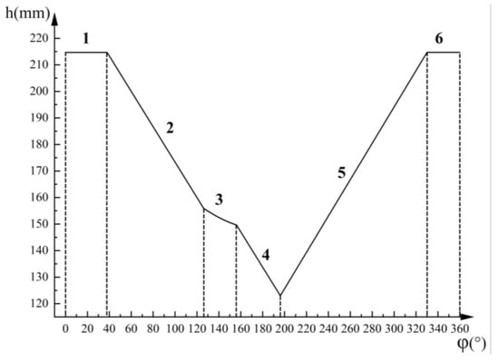 In conjunction with the working stages of the transposition mechanism, the positioning cam’s edge contour curve is divided into six stages. For greater clarity, the positioning cam’s functions are depicted in Figure 15.