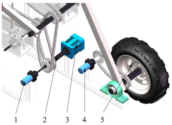 Schematic diagram of encoder installation: 1. rotary encoder 1 (monitoring motor speed); 2. power shaft; 3. DC brushless motor; 4. rotary encoder 2 (monitoring the speed of ground wheel); 5. ground wheel.