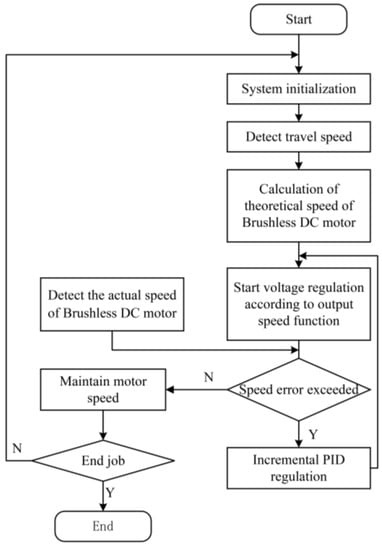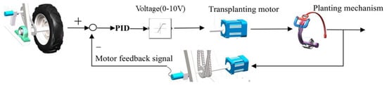 In this study, the M method was chosen to measure the speed of the transplanter’s ground wheel and DC brushless motor. The specific principle is to calculate the current forward speed of the machine and the motor speed by accumulating the total number of pulses that are measured by the encoder during the time interval. Equations (13) and (14) display the formulas for solving the traveling speed and the motor speed, respectively.