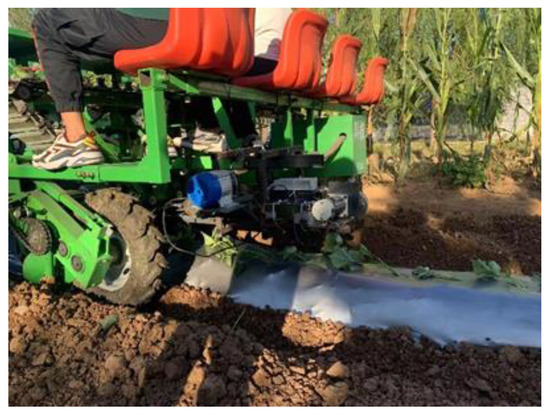 (2) In the field experiment, six groups of experiments were conducted with the forward speed of the machine as the test factor. The results showed that the qualification rate of the three indexes of the seedlings is high, the length of membrane holes is small, and the distance between the membrane holes is stable, which meet the operation requirements. The change rate of the membrane pore length is lower than 7.48%, and this is within the acceptable range.