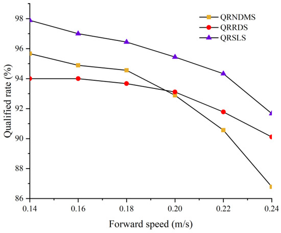 In Figure 24, the QRNDMS, the QRRDS, and the QRSLS are illustrated. The figure shows that as the machine’s forward speed increases, the pass rates of the three indicators decrease.