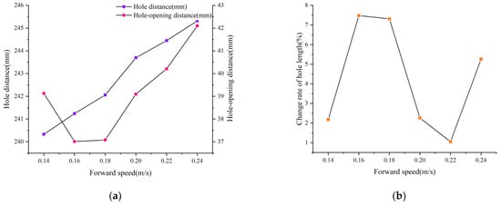 As depicted in Figure 25, the rules of the film hole spacing, the film hole length, and the film hole length change rate under various machine advance speeds are presented. According to the examination of the experimental phenomenon and relevant research literature, the causes of this occurrence are: (1) The slip rate of the ground wheel increases as the forward speed of the machine increases, thus causing the distance between the membrane holes to increase. (2) The plastic film is elastic and plastic, and its tensile speed correlates with its average elongation during a rupture. The following is the description of this process in detail.