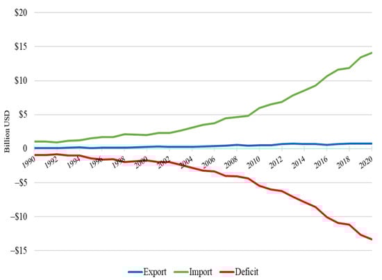Exchange rates also play an important role in international trade. Depreciation of the currency of a country boosts export by making exported goods cheaper in the international market. The Mexican peso depreciated over 50% within two years after NAFTA took effect in 1994, from USD 0.3 in July 1994 to USD 0.13 by the end of 1995. It continued to lose value over the years, reaching USD 0.05 in 2021, dropping 83% from the 1994 rate [49]. In the last 10 years (2011–2021), the Mexican peso lost approximately 40% of its value. The depreciation of a Mexican peso makes its exports more competitive, boosting the growth of imports from Mexico to the United States.