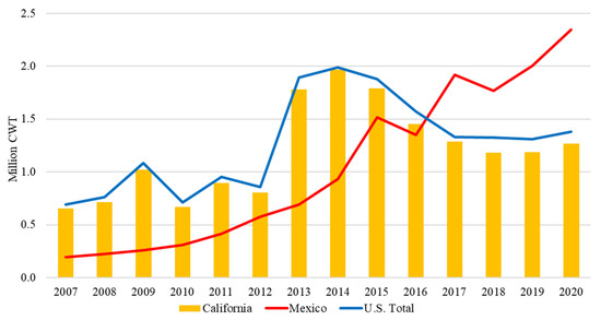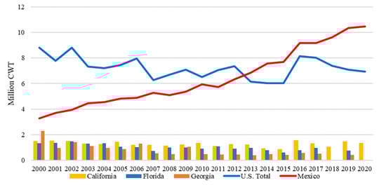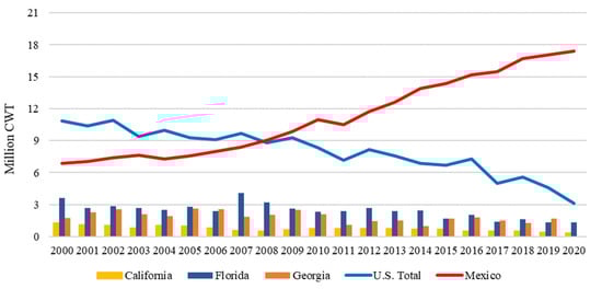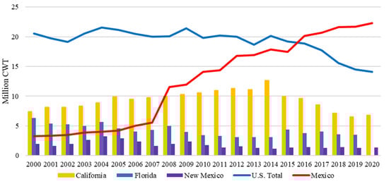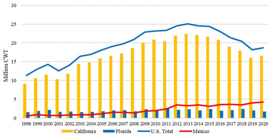 Strawberries are the second largest fresh berry imports from Mexico, accounting for 12% of the total value of fresh fruit imports from Mexico in 2020. Imports from Mexico accounted for 99% of the total volume of U.S. fresh strawberry imports in 2020 [11]. Its volume grew seven-fold from less than 0.6 million CWT in 1998 to over 4.3 million CWT in 2020 [11]. Whitin the same period, U.S. fresh strawberry production grew from 11 million CWT in 1998 to 25 million CWT in 2013, and then slowly declined to below 19 million CWT in 2020. The top two producers, California and Florida, supply over 97% of the U.S. domestic production [37]. In Figure 7, the production trends of both states follow a reversed U-shape trend similar to that of U.S. production. From 1998 to 2020, California production increased by 82% while Florida production increased by only 10% due to competition from Mexico. California strawberries are harvested between March and September while the Florida season is from November to April of the next year [35], highly overlapping with the Mexican season which is from November through March [39]. As a result, Mexican competition poses stronger challenges to the Florida strawberry industry [40]. In 1998, Florida production was 1.6 million CWT, approximately three times higher than imports from Mexico; in 2020, it was 1.78 million CWT, less than one-half of the Mexican imports (4.3 million CWT).