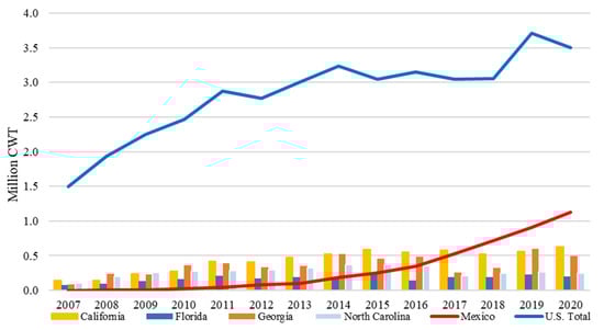 The popularity of blueberries has been growing globally due to its high antioxidant content and other health benefits [41]. Blueberries also became one of the major fresh fruit imports from Mexico. Imports from Mexico accounted for 23% of the total volume of U.S. fresh blueberry imports in 2020 [11] and are expected to continue to grow. Prior to 2012, fresh blueberries accounted for less than 1% of the total value of fresh fruit imports from Mexico, but it increased to 6% in 2020 [11]. Imports grew exponentially from less than three thousand CWT in 2008 to over 1 million CWT in 2020 (Figure 8). The total U.S. production of blueberries has been growing at a much slower rate, increasing from about 2 million CWT in 2008 to 3.5 million CWT in 2020 (Figure 8). Blueberries are produced across the United States. Major producers include California, Oregon, Washington, Florida, Georgia, North Carolina, and Michigan [37]. Among these states, only the Sunbelt states’ harvesting windows (California, Florida, Georgia, and North Carolina) overlap with the peak season of Mexico. The harvesting windows of the Sunbelt states are from April to June while those of the northern states are July and August [35]. In Mexico, blueberry harvesting begins in September and continues through June of the next year, peaking from February to May [15]. Due to the overlapping harvesting windows, California, Florida, Georgia, and North Carolina blueberries face greater competition from Mexico. Florida, with a short, two-month harvesting window falling entirely within the peak harvesting months of Mexican blueberries, faces the strongest competition, which is expected to further intensify in coming years as Mexico quickly expands its production capacity [15]. Besides Mexico, Peru and Chile are the other two major exporters of fresh blueberries to the U.S. market. The two countries respectively accounted for 38% and 24% of U.S. fresh market blueberry import volume in 2020 [11].