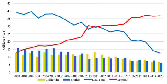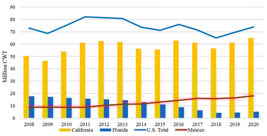 The citrus family includes limes, lemons, oranges, grapefruit, tangelos, and tangerines [35]. Despite the fall in orange juice consumption due to health concerns, fresh citrus consumption remained stable in the last two decades in the United States [16]. California and Florida are the two major producers of fresh citrus, accounting for over 93% of U.S. fresh citrus production in the past decade [37]. However, production in the two states shows different industry trajectories. The annual production of California fluctuated between 55 and 65 million CWT in the past decade while the production in Florida dropped 66% from 15.7 million CWT in 2011 to 5.3 million CWT in 2020 (Figure 9). In Figure 9, the trends show that Florida fresh citrus production shrank while imports from Mexico doubled from 8.7 million CWT in 2008 to 18 million CWT in 2020. Imports from Mexico accounted for 56% of the total volume of U.S. fresh citrus imports in 2020 [11]. Chile and Peru are the other two major exporters of fresh citrus to the U.S. market. The two countries respectively accounted for 21% and 7% of U.S. fresh citrus import volume in 2020 [11]. California produces limes, lemons, and oranges year round and grapefruits and tangerines over half of the year. In Florida, oranges and grapefruits are harvested every month except August and September and tangerines harvested from October to April of the next year [35]. In Mexico, limes and lemons are harvested all year long; oranges are harvested from November to May of the next year; grapefruits are harvested from June to November [42]. For almost every month, there are overlaps in harvesting windows between Mexico and the two states in at least one citrus variety. The only exception is August when Florida does not harvest any citrus variety. Competition from Mexico is expected to continue to grow, which will pose further challenges to an industry that is being ravaged by citrus greening [43].
