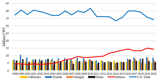 Fresh watermelon imports from Mexico have grown three-fold from 4.5 million CWT in 1998 to over 14 million CWT in 2020 (Figure 10). Imports from Mexico accounted for 85% of the total volume of U.S. watermelon imports in 2020 [11]. Guatemala and Honduras were the other two major exporters of watermelon to the U.S. market. The two countries respectively accounted for 8% and 5% of U.S. watermelon import volume in 2020 [11]. The value of U.S. imports of watermelons from Mexico accounted for 10% of the total value of fruit imports from Mexico in 2010, but the percentage declined to 4% in 2020 [11]. Rapid increases in imports of other higher value fresh fruits such as strawberries and blueberries may explain the simultaneous increase in volume and decrease in the share of import value. Four states (Florida, 25%; Georgia, 20%; Texas, 16%; California 14%) in the Sunbelt accounted for more than three-quarters of the total U.S. production [37]. The trends in Figure 10 show that the U.S. annual production fluctuated between 33 million CWT and 42 million CWT in the last two decades. Watermelons are usually harvested from April to October in the United States [35] and from December to May of the next year in Mexico [44]. The watermelon harvesting window in Mexico fills the production gap in the United States, suggesting Mexican and U.S. watermelons are not competing directly in most of the months. The nonconcurrent harvesting windows may explain why U.S. production did not plunge when the volume of Mexican imports increased more than three-fold over the last two decades.