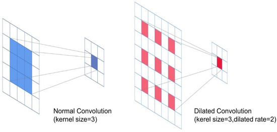 In recent years, dilated convolution has been widely used in tasks, such as semantic segmentation [22] and target detection [23]. Dilated convolution is supposed to expand the convolution kernel by adding some zero elements between the elements of the convolution kernel, and the expansion rate is used to express the degree of convolution kernel expansion. The comparison between normal convolution and dilated convolution operations is shown in Figure 2. Dilated convolution can greatly increase the effective receptive field of the convolutional network. The advantages of dilated convolution include fewer parameters, no change in the feature map size, and high resolution of image. Global information is important for image understanding, especially for fine-grained disease classification. The dilated convolution was applied to the classification of fine-grained crop diseases in this study.