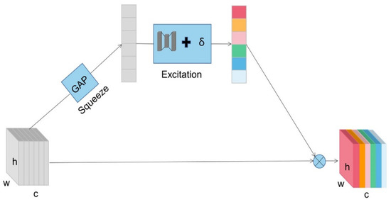 Different channels capture different characteristics, and channel attention is used to measure the importance of these channels. SE-net as a typical network of channel attention exhibits the strong performance that won the last ImageNet Large Scale Visual Recognition Challenge (ILSVRC) [24]. Therefore, the channel attention module SE module in SE-net is employed as a prototype of the attention mechanism in this study. As shown in Figure 3, SE module consists of two main components, including squeeze and excitation. Global average pooling (GAP) is used to compress the features of a two-dimensional channel into a real number. Two fully connected layers allow the construction of interdependencies between different channels while reducing the number of parameters. Finally, normalized weights are generated using a sigmoid function to reweight the features. In this way, the key features can be strengthened, and useless features can be suppressed.