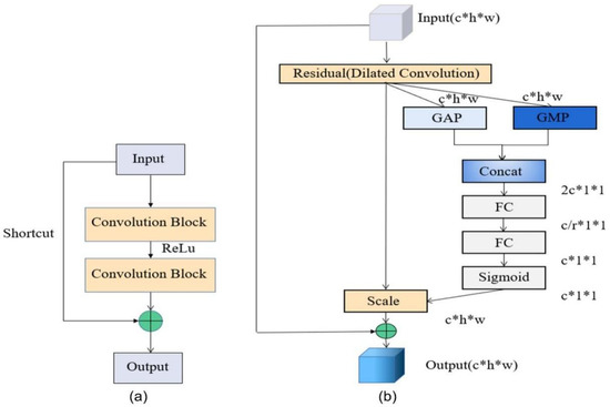 The DC-DPCA module is a combination of dilated convolution (DC) and DPCA. In this paper, we replace some of the standard convolutional kernels in convolution blocks with dilation convolution and embed the DPCA module into the network. Dilated convolution can provide effective information input to the attention mechanism, and the DPCA module can perform effective feature reweighting on the feature map to pick out representative features. It is noteworthy that they are both deployed in the deeper layers of the network. The structure diagram of embedding the DC-DPCA module in the residual module is shown in Figure 4. The residual module is mainly composed of two convolution blocks and a shortcut. We replace the standard convolution in the residual module with the dilated convolution and embed the DPCA module between the two residual modules.