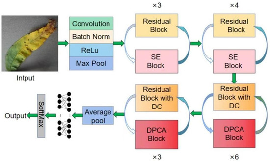 The overall structure of the DC-DPCA module embedded in ResNet50 [26] is shown in Figure 5. It mainly contains several residual modules, several SE modules, and several DC-DPCA modules. The crop disease images are resized to 224 × 224 and fed into the network. After the features are extracted by the network, they are fed into the classifier (the fully connected layer) for classification.