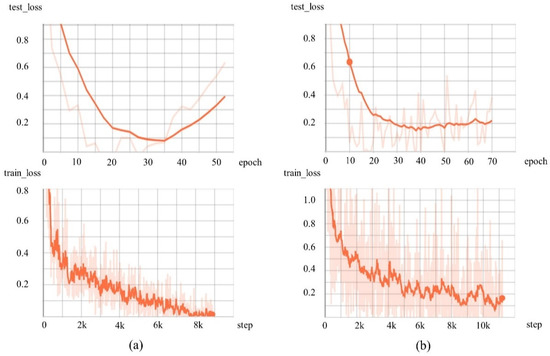 Using the traditional cross-entropy loss function (Figure 6a), we found that after the 35th epoch, the loss on the training set decreases, but the loss on the test set increases instead, which is a typical phenomenon of overfitting and seriously affects the learning ability of the model. The reason for this problem is the unbalanced distribution of the dataset. An unbalanced data distribution leads to an unbalanced loss distribution. Categories with more samples will generate a large percentage of losses, and the network will overlearn these categories with more attention to minimize the overall loss. This leads to poor generalization of the network and increasing errors on the test set (overfitting phenomenon). From Figure 6b, we can see that the L-balance loss function can well solve the overfitting problem caused by unbalanced data distribution. Since the L-balance loss function adds a weighting factor to the cross-entropy loss function, this weighting factor gives less weight to the category with a larger number of samples. This treatment balances the distribution of losses and does not lead to overlearning of the network for certain categories, which affects the generalization ability of the model.