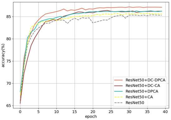 The traditional channel attention module (SE module), channel attention with dilated convolution module (DC-CA), DPCA module, and DC-DPCA module were embedded into ResNet50 to demonstrate the superiority of the method. DC-DPCA module is deployed in the last two stages of ResNet50 with dilated rates of [1, 2, 3, 1, 2, 3, …]. Figure 7 shows the accuracy of embedding different modules in ResNet50. For the traditional channel attention module, no significant improvement of accuracy of fine-grained classification was observed.