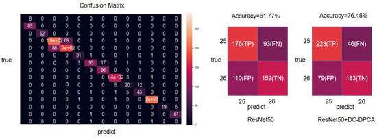In order to understand the specific classification of each disease category, we analyzed the confusion matrix of the classification results for the data in the partial test set, as shown in the left part of Figure 8. Each column of the confusion matrix represents the predicted category and each row represents the true category, and only the elements on the diagonal of the confusion matrix are the elements that are correctly classified. Further, we chose the 25th category with the highest error rate (general citrus greening) to compare the classification ability of the network for difficult samples, as shown in the right part of Figure 8, where TP, TN, FP, and FN represent the number of samples with both labeled and predicted values of 25, the number of samples with both labeled and predicted values of 26, the number of samples with labeled values of 26 but predicted values of 25, and the number of samples with labeled values of 25 but predicted values of 26, respectively. Compared with the original network, the accuracy of ResNet50 with the embedded DC-DPCA module is greatly improved. This indicates that the DC-DPCA module has good classification ability for difficult samples.