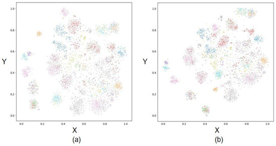 t-SNE of features learned by networks. (a) ResNet50 + SE. (b) ResNet50 + DC-DPCA.
