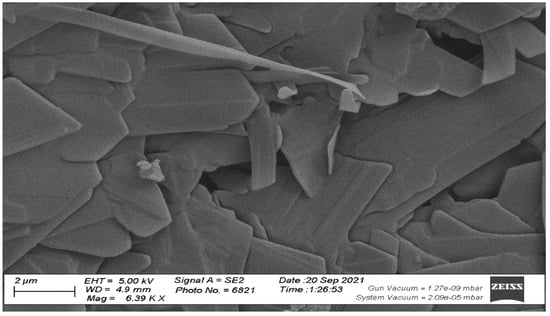 The wastes of shrimp were brought from a fish restaurant located in Assiut Governorate, Egypt. The collected waste was air-dried and crushed. Shrimp waste was pyrolyzed at 350 °C for 3 h before being crushed and sieved through a 2 mm sieve. The loss-on-ignition method described by Matthiesen et al. [] was used in the determination of the total organic carbon of the biochar sample. Biochar pH was determined in 1:5 (biochar/water) by a digital pH meter. Biochar salinity was measured by an electrical conductivity meter []. The biochar sample was digested by a mixture of HClO4 and HNO3 at a ratio of 1:2 []. The concentrations of potassium (K), calcium (Ca), iron (Fe), manganese (Mn), zinc (Zn), copper (Cu), lead (Pb), and cadmium (Cd) in the digested biochar sample were determined by ICP−OES, thermo iCAP 6000 series. The detection limits for Cd and Pb are: 0.07 and 1.06 µg L−1, respectively. Nitogen (N) in the biochar sample was determined by the Kjeldahl method, while phosphorus was determined by a spectrophotometer at 660 nm. Table 1 shows the main characteristics of shrimp waste biochar (SWB). The surface morphology of the shrimp waste biochar was examined by scanning electron microscopy (SEM) using a Carl Zeiss sigma 500 VP and JSM 5400 LV. The SEM image of shrimp waste biochar is shown in Figure 1. The electron micrograph of the biochar sample shows that it has a sheet structure and is characterized by a large specific surface area.